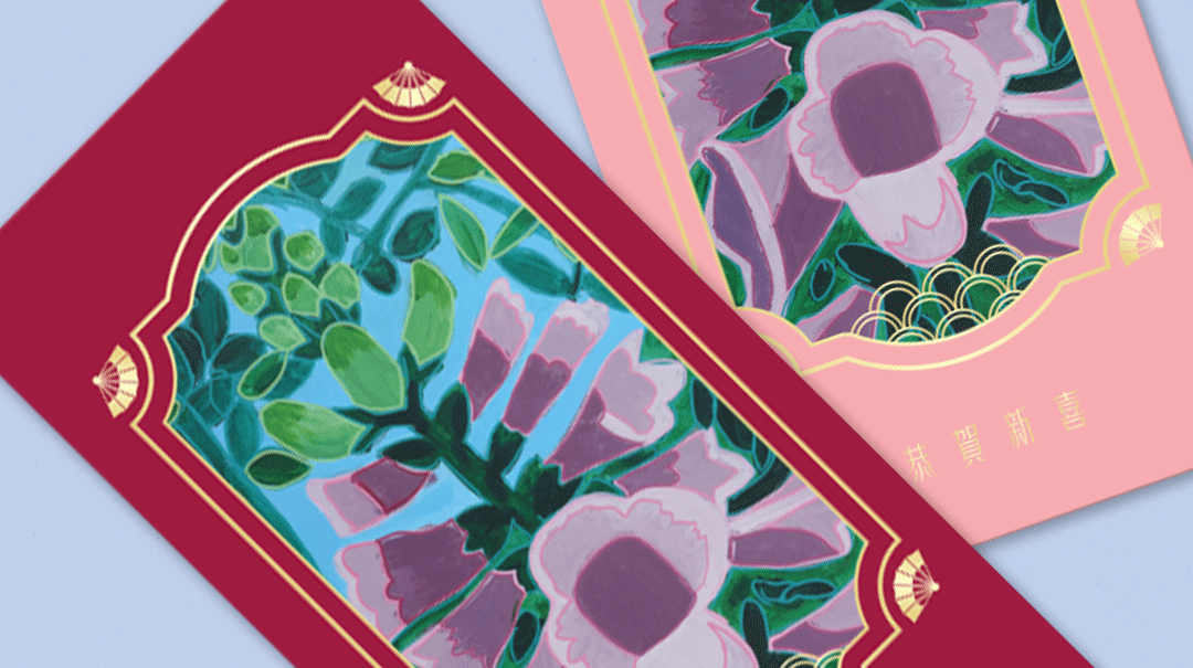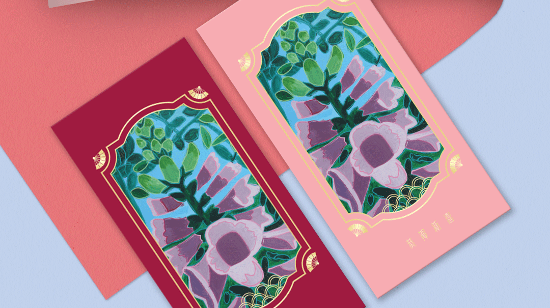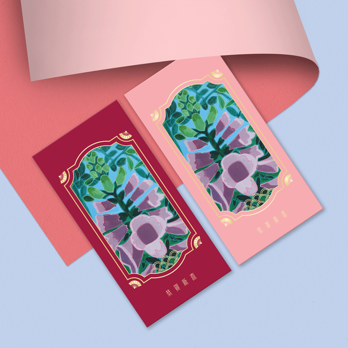 The red packet features a striking floral design set against a deep maroon and light pink background. The central image showcases a beautiful arrangement of blooming flowers in shades of pink and green, symbolizing growth and renewal. The artworks are produced by artists from Eden Talent Development Programme (Visual Arts) of Eden Expression. Eden School, an autism specific school provides quality education for students on the autism spectrum, with aims to maximise their potential and transform lives positively.